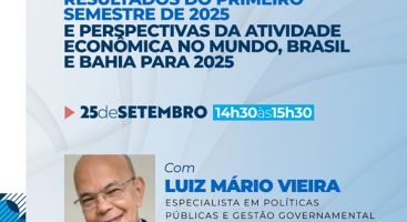 Live de Conjuntura Econômica da SEI acontece nesta quinta-feira (25) Os resultados do primeiro semestre de 2025 e as perspectivas da atividade econômica no mundo, Brasil e Bahia para o ano são o tema da apresentação de Conjuntura Econômica, que acontecerá na próxima quinta-feira (25), no canal SEI BAHIA, no Youtube. A apresentação será realizada … Leia Mais