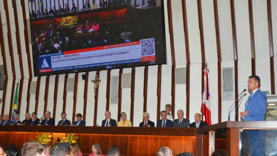 Em seu pronunciamento, o deputado Eduardo Salles destacou a importância de reconhecer a contribuição da empresa e de seu fundador. “Hoje é um dia de grande alegria para a ALBA. Por proposição nossa e aprovação da presidente Ivana Bastos, estamos realizando uma justa e importante sessão especial pelos 80 anos do Grupo Novonor e 60 anos da Fundação Norberto Odebrecht”, afirmou o parlamentar.